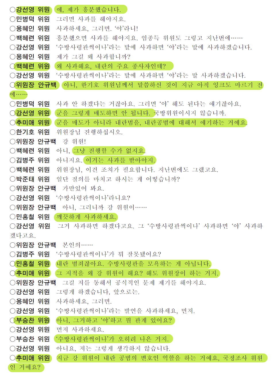 - 김병주 위원과 안규백 위원장은 계속 지적하며 멈추게 했고 강선영 씨와 임종득 씨가 한 마디씩 거들었다.